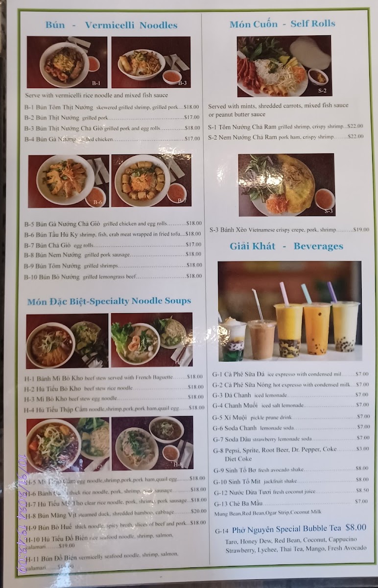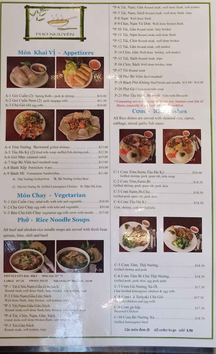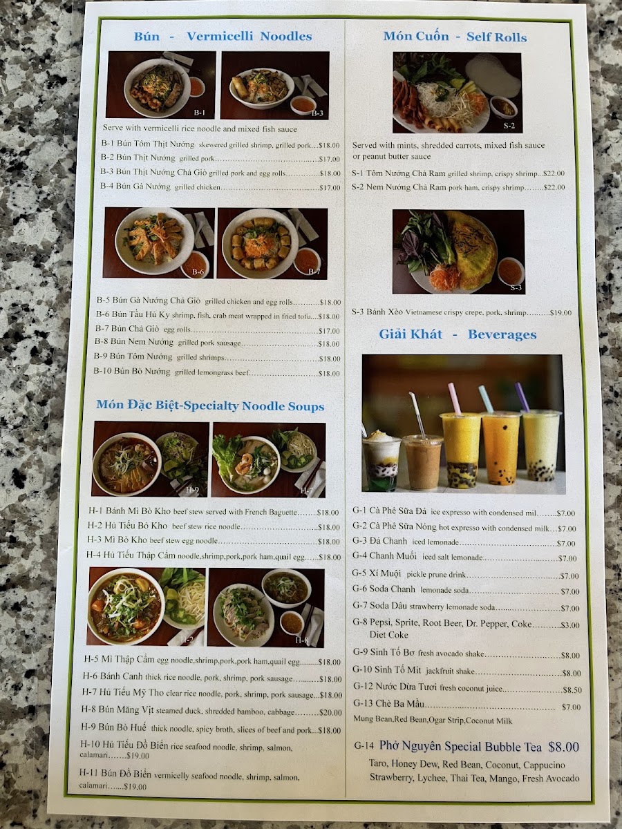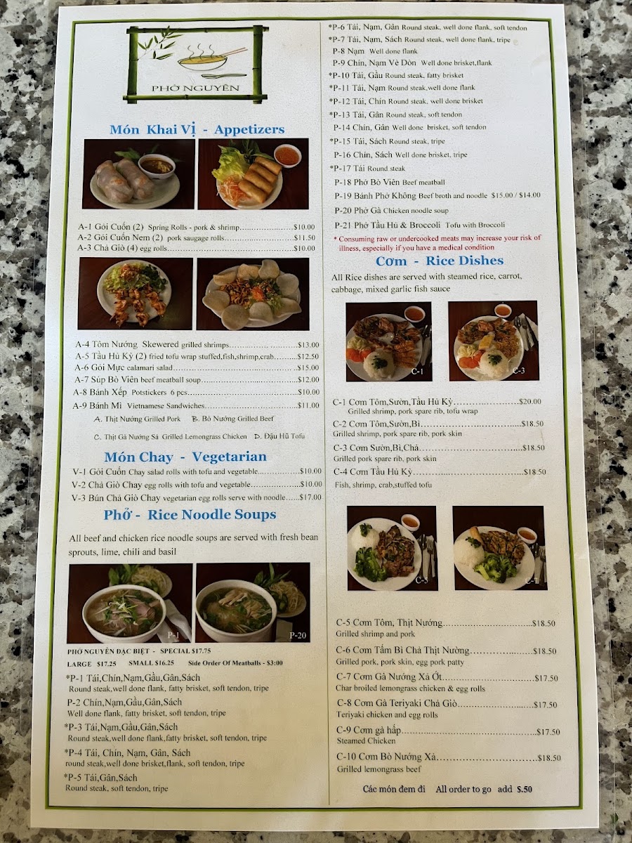 The menu at Phở Nguyên Restaurant offers a straightforward, comforting selection of traditional Vietnamese dishes that suit a relaxed dining experience. It features classic bowls of pho alongside casual bites like charbroiled lemongrass chicken and fresh spring rolls, fitting well with both quick lunches and leisurely dinners.