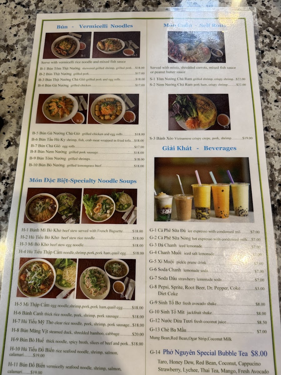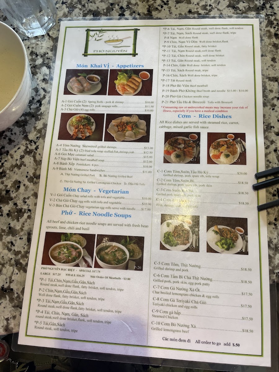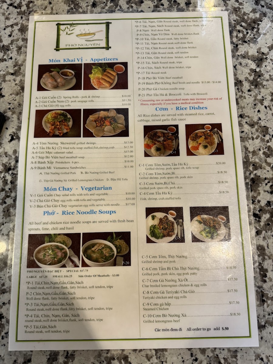 The menu at Phở Nguyên Restaurant offers a straightforward, comforting selection of traditional Vietnamese dishes that suit a relaxed dining experience. It features classic bowls of pho alongside casual bites like charbroiled lemongrass chicken and fresh spring rolls, fitting well with both quick lunches and leisurely dinners.
